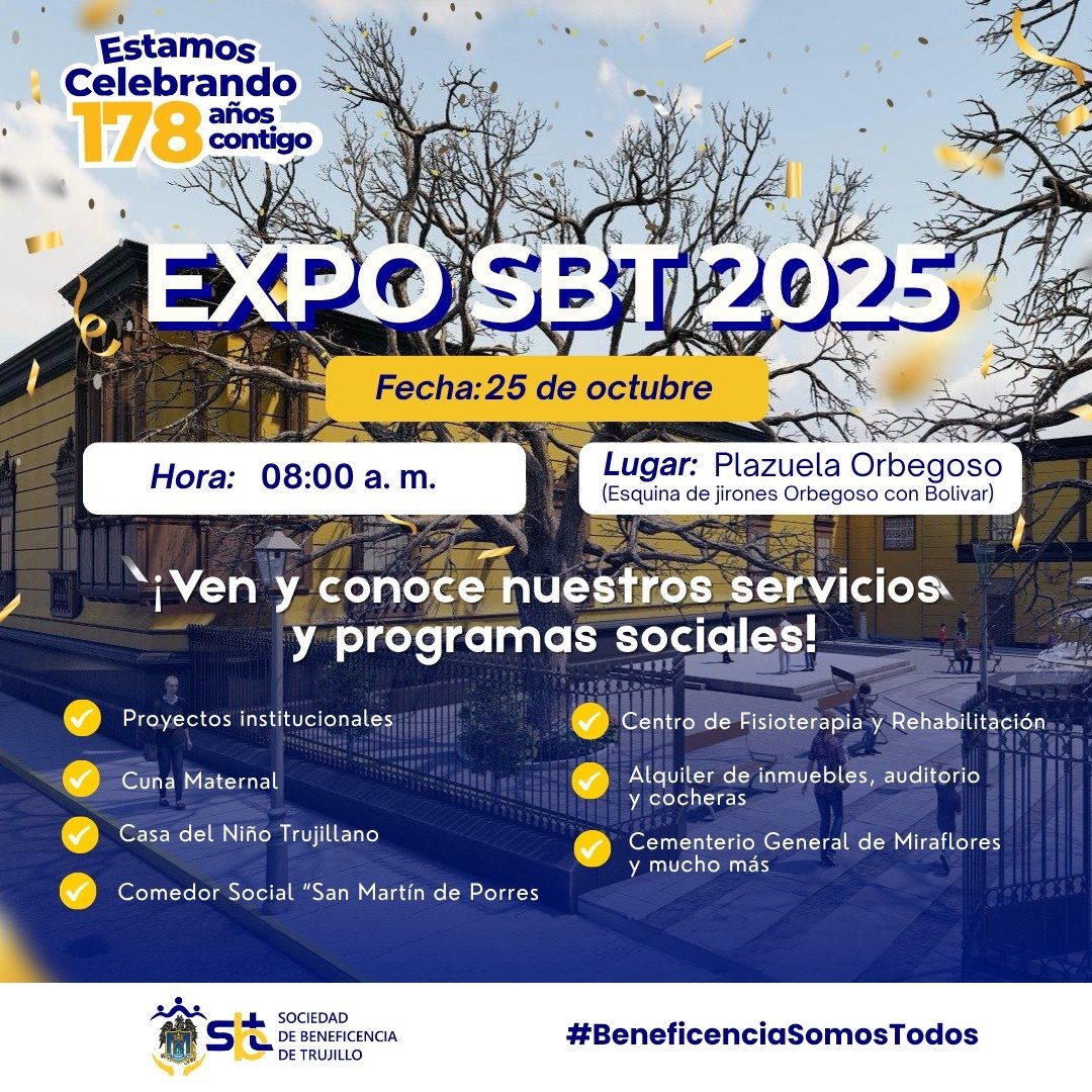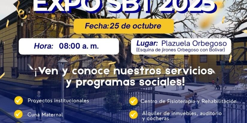 La Sociedad de Beneficencia de Trujillo (SBT), con el objetivo de dar a conocer sus servicios y programas sociales, realizará la campaña de difusión “Expo SBT 2025”, que se desarrollará este sábado 25 de octubre, en la Plazuela San Agustín (entre los jirones Orbegoso y Bolívar – Centro Histórico), desde las 8:00 a. m. hasta la 1:00 p. m.