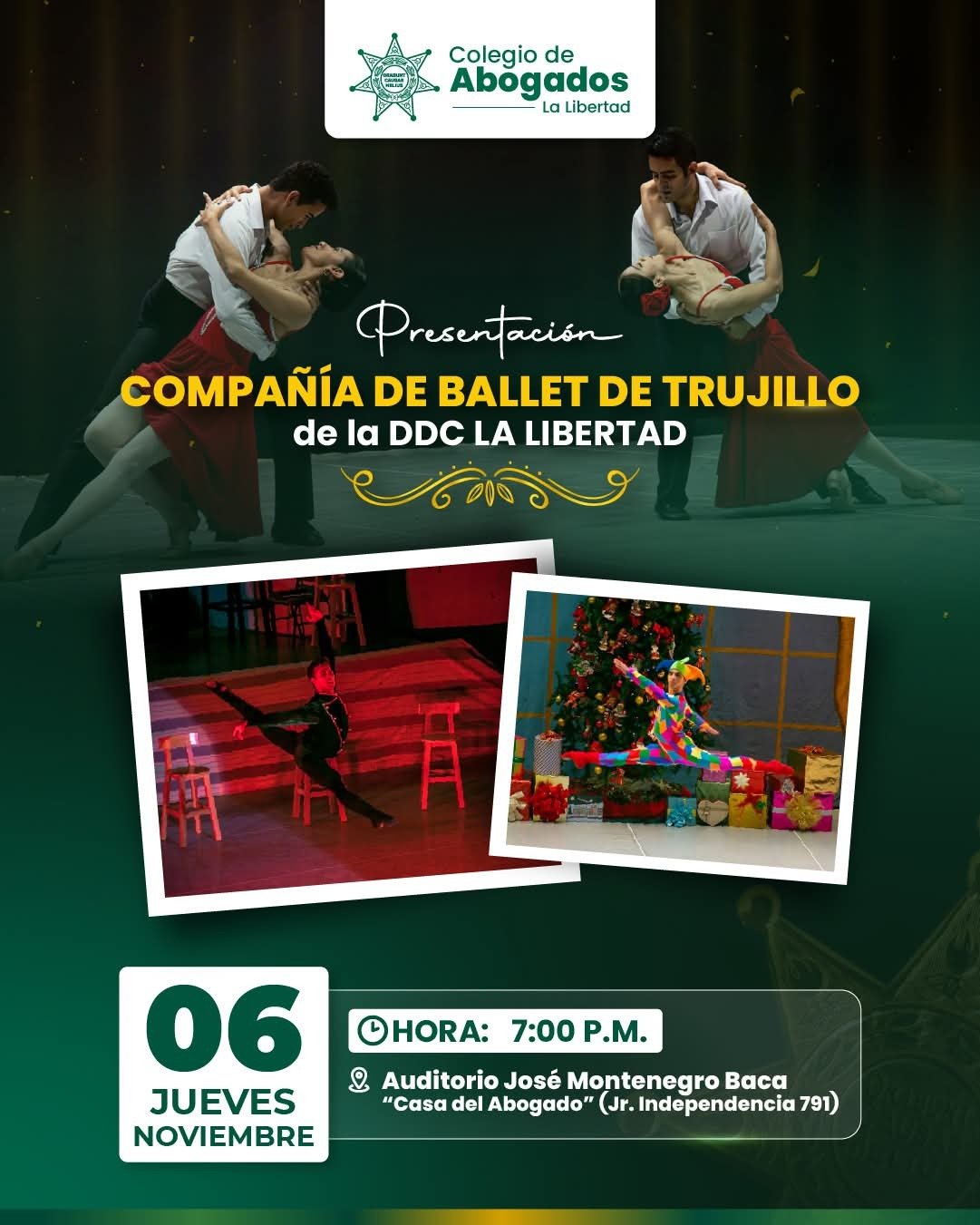 El Colegio de Abogados de La Libertad invita al público en general a la presentación de la Compañía de Ballet de Trujillo de la Dirección Desconcentrada de Cultura (DDC) La Libertad este jueves 6 de noviembre a las 7:00 pm, en el Auditorio José Montenegro Baca – Casa del Abogado, ubicado en el jirón Independencia 791. Esta presentación se realiza como parte de su compromiso con la promoción del arte y la cultura.
