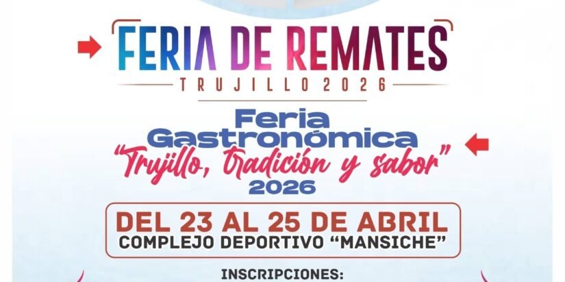 Apoyando a emprendedores y empresarios a los que no les cobrarán por participar, la Municipalidad Provincial de Trujillo (MPT) organiza por segundo año consecutivo la Feria de Remates Trujillo 2026 y el Festival gastronómico: Trujillo, tradición y Sabor, del 23 al 25 de abril en el complejo Mansiche, con ingreso totalmente libre.