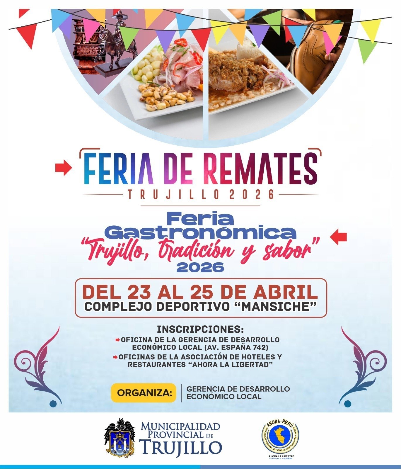 Apoyando a emprendedores y empresarios a los que no les cobrarán por participar, la Municipalidad Provincial de Trujillo (MPT) organiza por segundo año consecutivo la Feria de Remates Trujillo 2026 y el Festival gastronómico: Trujillo, tradición y Sabor, del 23 al 25 de abril en el complejo Mansiche, con ingreso totalmente libre.