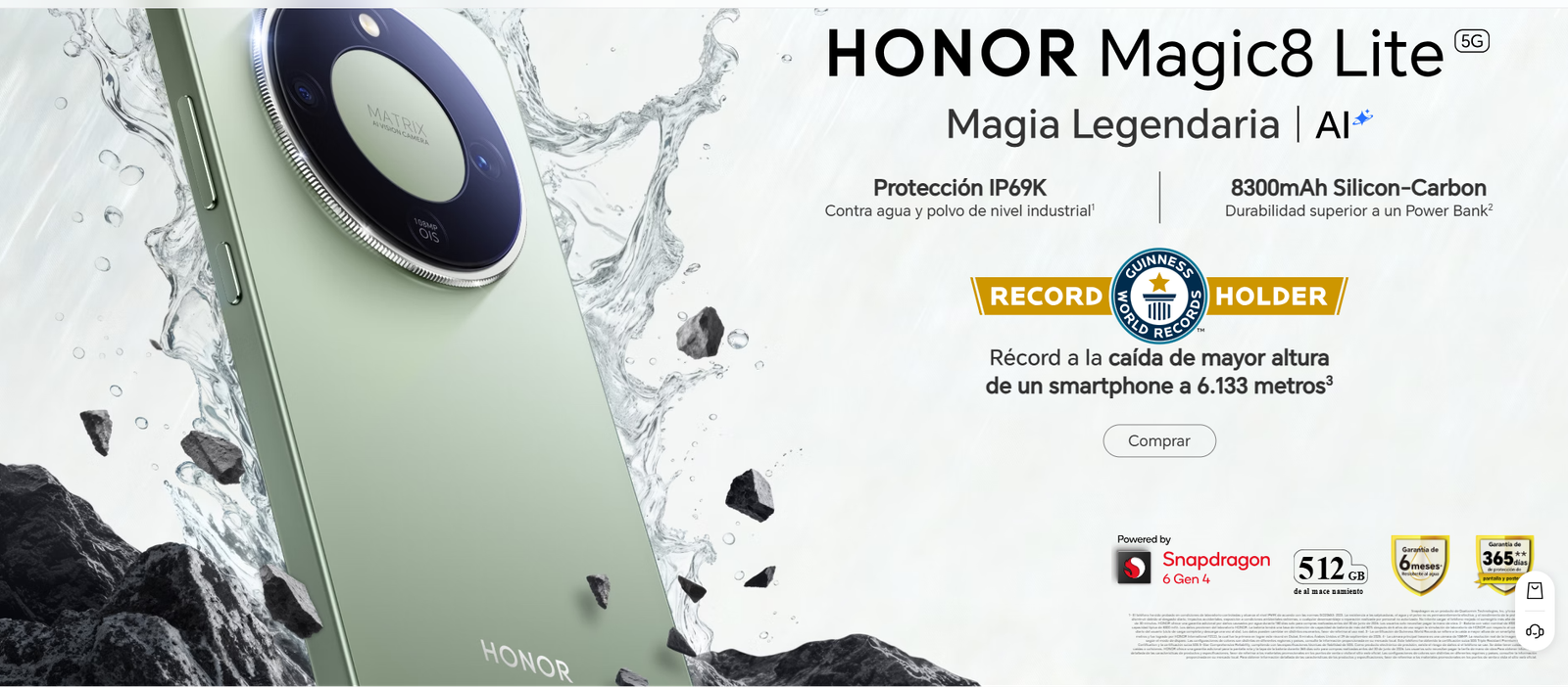 El dispositivo destaca por su resistencia certificada. Obtuvo un Récord Guinness tras soportar una caída desde 6,133 metros de altura en Dubái. Además, cuenta con certificaciones IP69K, IP68 e IP69 que lo protegen frente al agua, incluso bajo alta presión y temperatura. Su estructura incorpora Corning® Gorilla® Glass Victus® 2 y tecnología HONOR Anti-Drop, diseñada para absorber impactos y resistir caídas de hasta 2.5 metros.