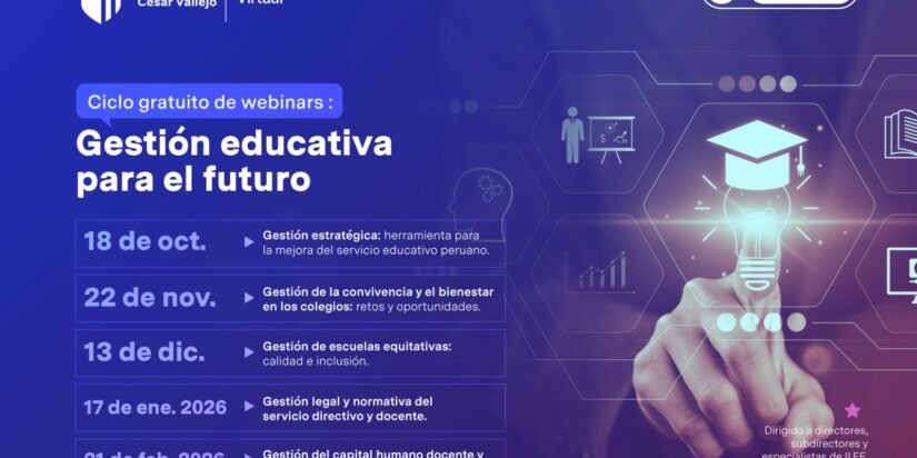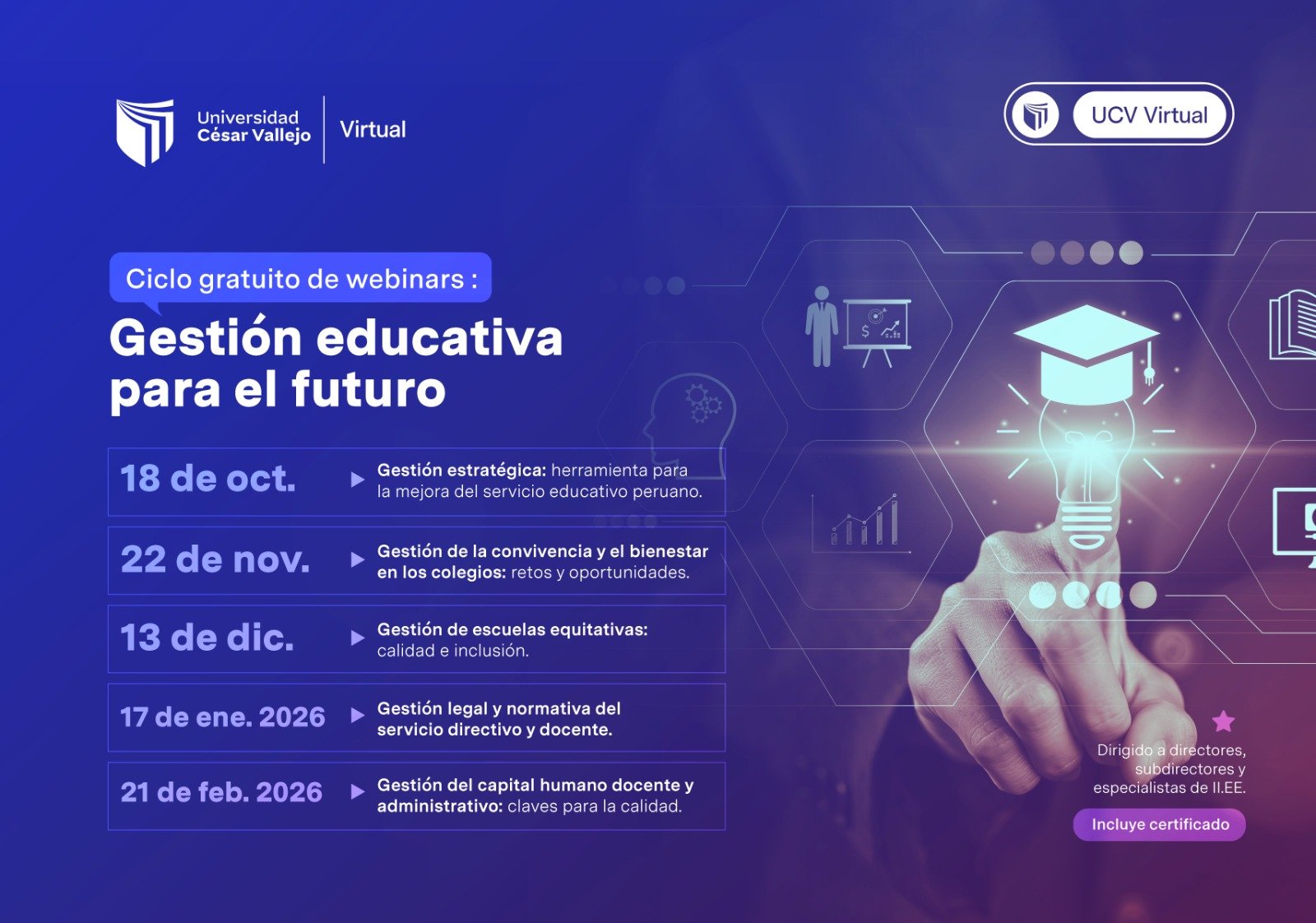 La Universidad César Vallejo (UCV), a través de su modalidad UCV Virtual, presenta el ciclo gratuito de webinars “Gestión Educativa para el Futuro”, un espacio de aprendizaje y actualización en el campo de la educación.